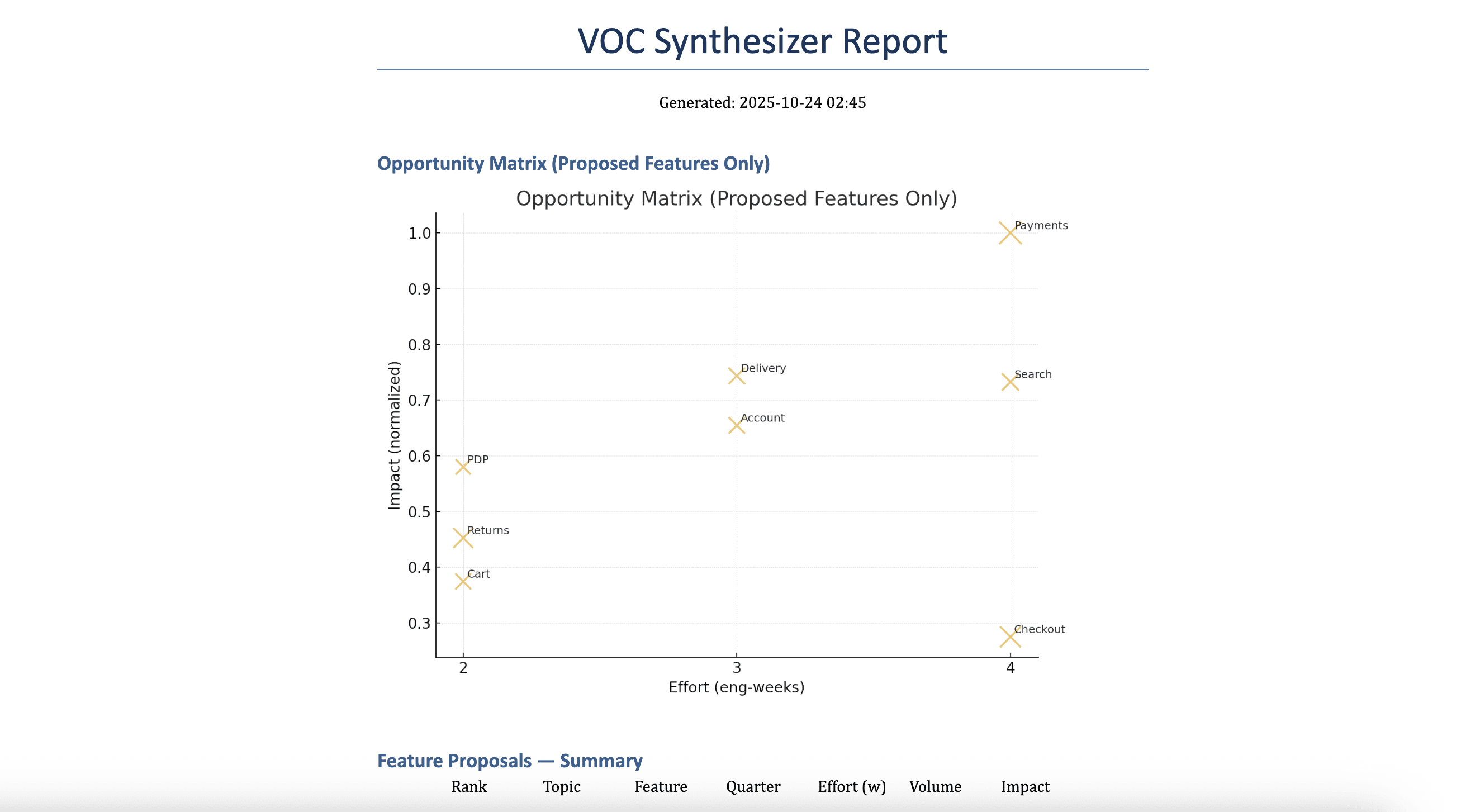 feature_briefs.csv+ per-feature details rendered in the report.Checks: Duplicate detection, scope realism (effort bounds), metrics clarity.