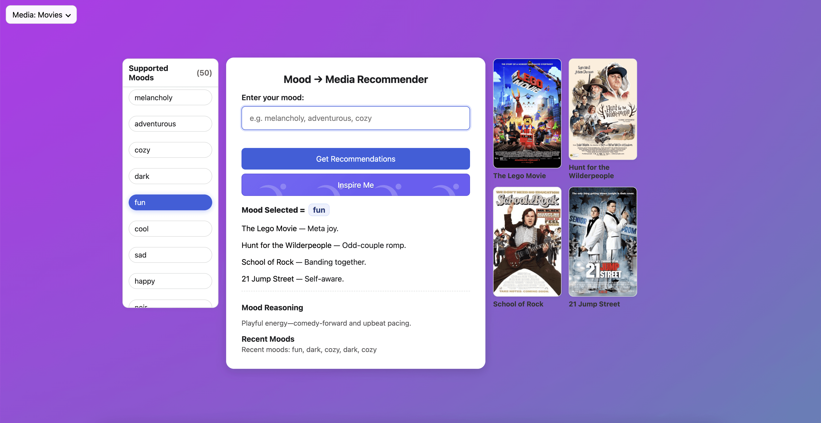 A single-file, no-framework web app that turns vibes into watch-and-read lists. Type a mood (“melancholy,” “epic,” “playful”) or pick from 50 supported moods, and the app instantly recommends 4 titles tailored to your mood across Comics, Movies, or TV via a sticky Media Dropbox.